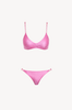The Solid Chain Bikini in vibrant pink radiates playful sophistication with its sleek, shimmering finish. Crafted from a smooth stretch fabric, the top features a classic scoop silhouette accented by bold chain-link straps, while the matching bikini bottom offers a flattering low-rise cut