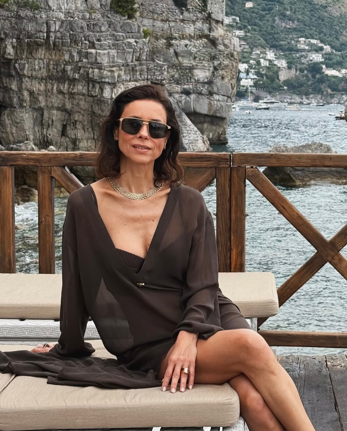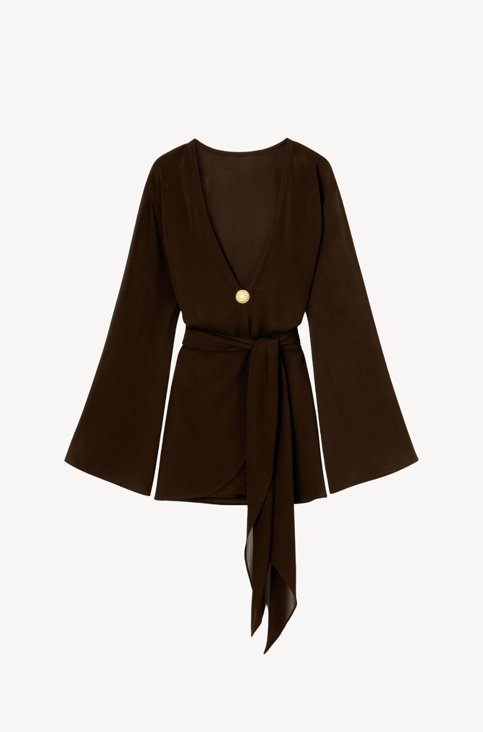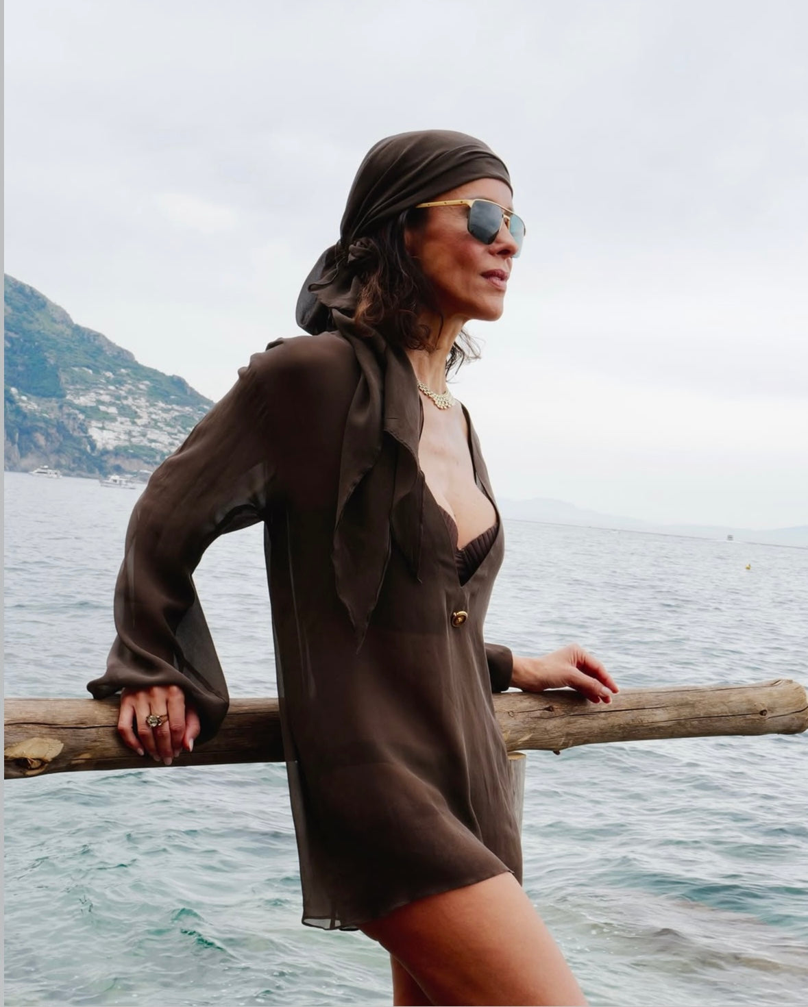 Effortlessly elegant and endlessly versatile, this sheer silk cover-up by Al Mare is designed for coastal sophistication. It features a detachable gold brooch in the neckline. It also comes with a matching silk scarf that can be worn as a headscarf or tied at the waist as a belt.